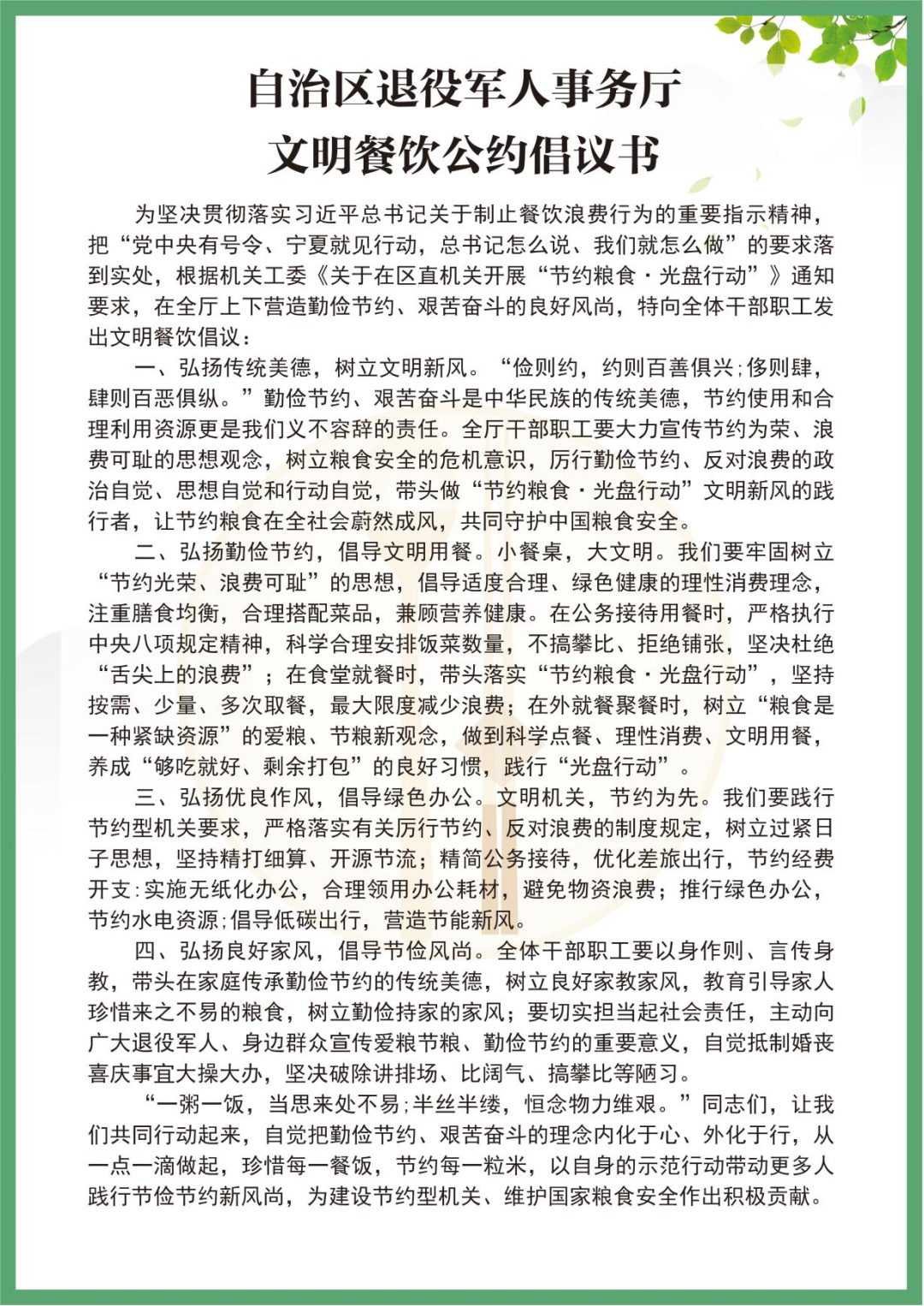 自治区退役军人事务厅坚决贯彻落实习近平总书记关于制止餐饮浪费行为的重要指示精神,积极动员部署“节约粮食·光盘行动”,强化组织领导、细化工作措施、营造浓厚氛围,引导干部职工争做优良风尚的践行者、传播者、倡导者,全面助力文明型机关建设纵深推进。