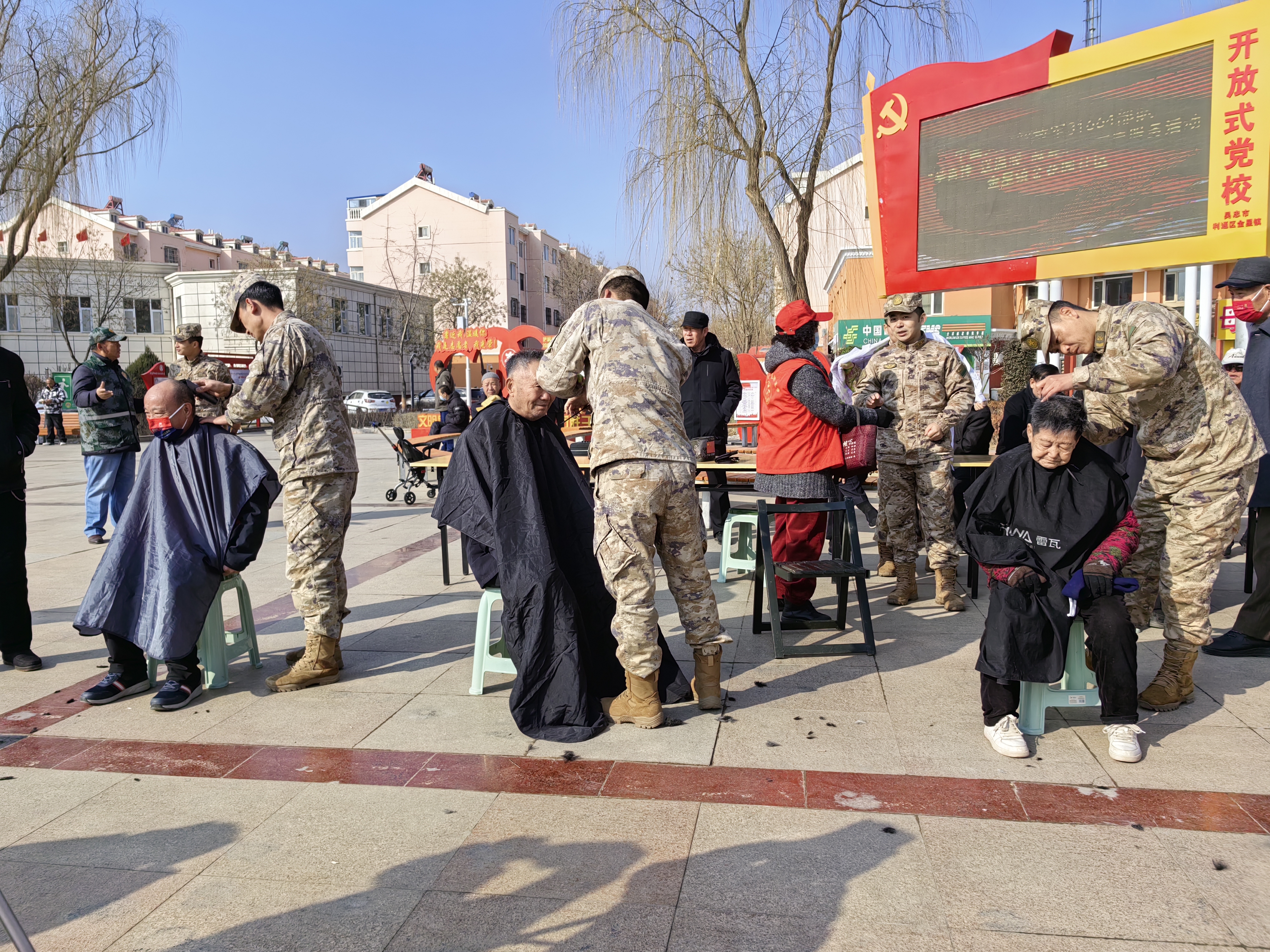 部队官兵和医护人员还为社区群众开展免费理发、义诊服务,他们认真为群众做检查,回答医疗、保健方面的咨询,提醒大家养成良好的生活习惯,树立健康生活的理念。